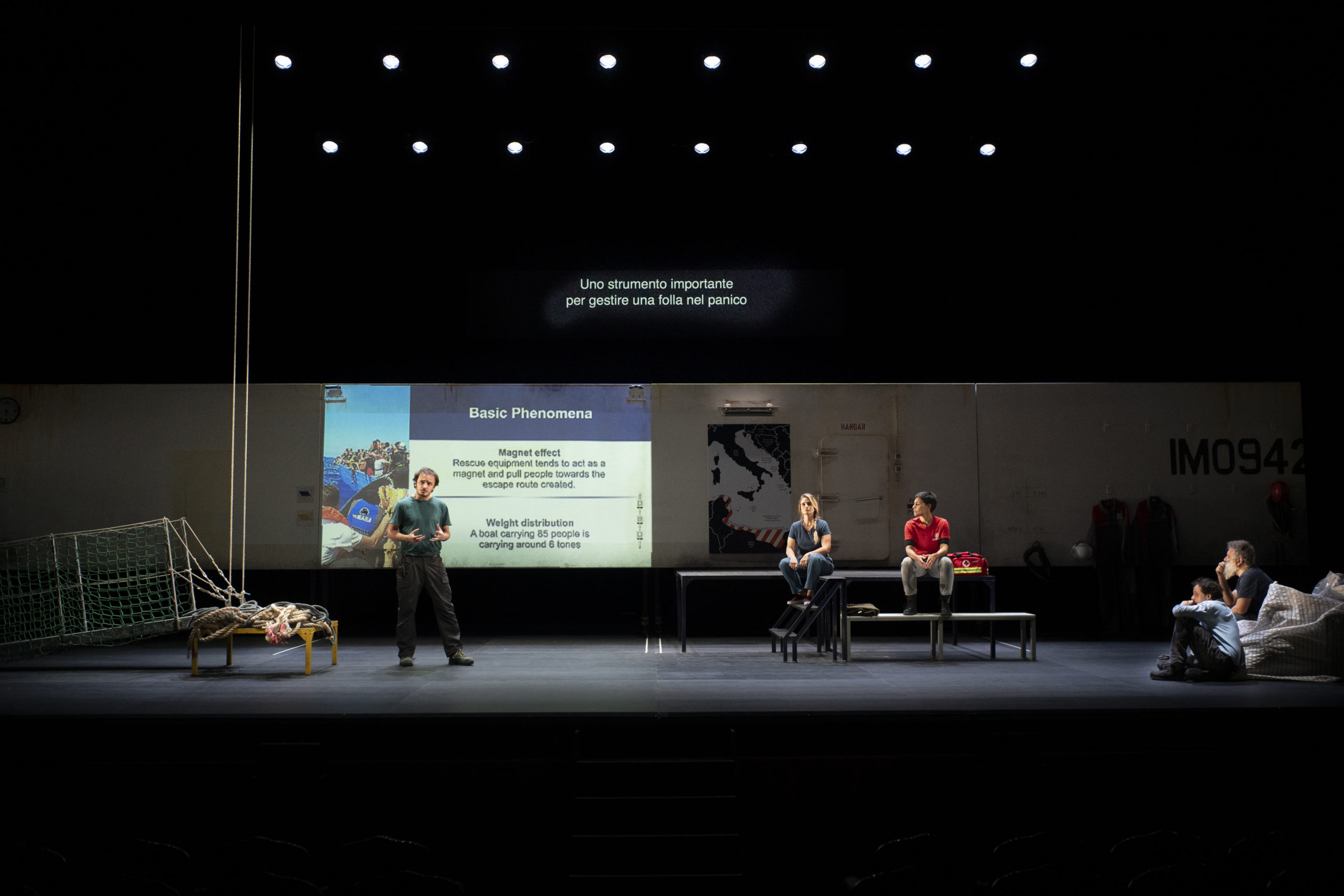 La compagnia Kepler-452 si imbarca su una nave di ricerca e soccorso nel Mediterraneo Centrale per tentare di capire in prima persona cosa avviene sulla rotta migratoria più letale al mondo. In quasi cinque settimane di navigazione, l’equipaggio soccorre 156 persone, sbarcate poi nel “place of safety”, il porto di La Spezia. Lo spettacolo è il risultato di un’indagine sul campo, iniziata con le interviste dei registi Enrico Baraldi e Nicola Borghesi, proseguita con una residenza a Lampedusa e la successiva partenza per la rotta mediterranea. Lungo il percorso, gli artisti hanno incontrato operatori di Life Support, la nave di EMERGENCY e di Sea-Watch, che sono diventati i protagonisti della pièce, in scena con Nicola Borghesi. A place of safety è la storia dell’incontro tra una compagnia teatrale e un gruppo di persone che ha deciso di dedicare parte della propria vita al soccorso in mare, ed è al tempo stesso un discorso intimo su ciò che l’Europa vorrebbe e potrebbe essere.