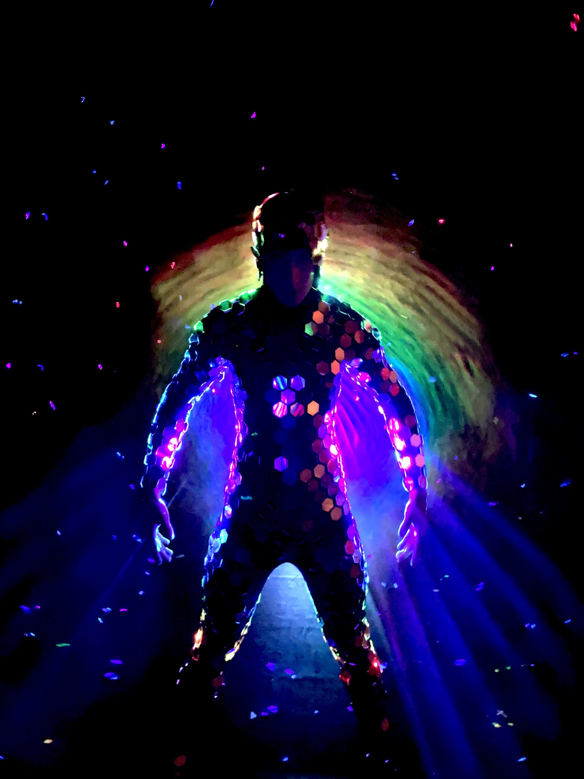L’illuminazione futuristica contrasta l’oscurità che avvolge i performer, che nuotano luminescenti in un blu misterioso.